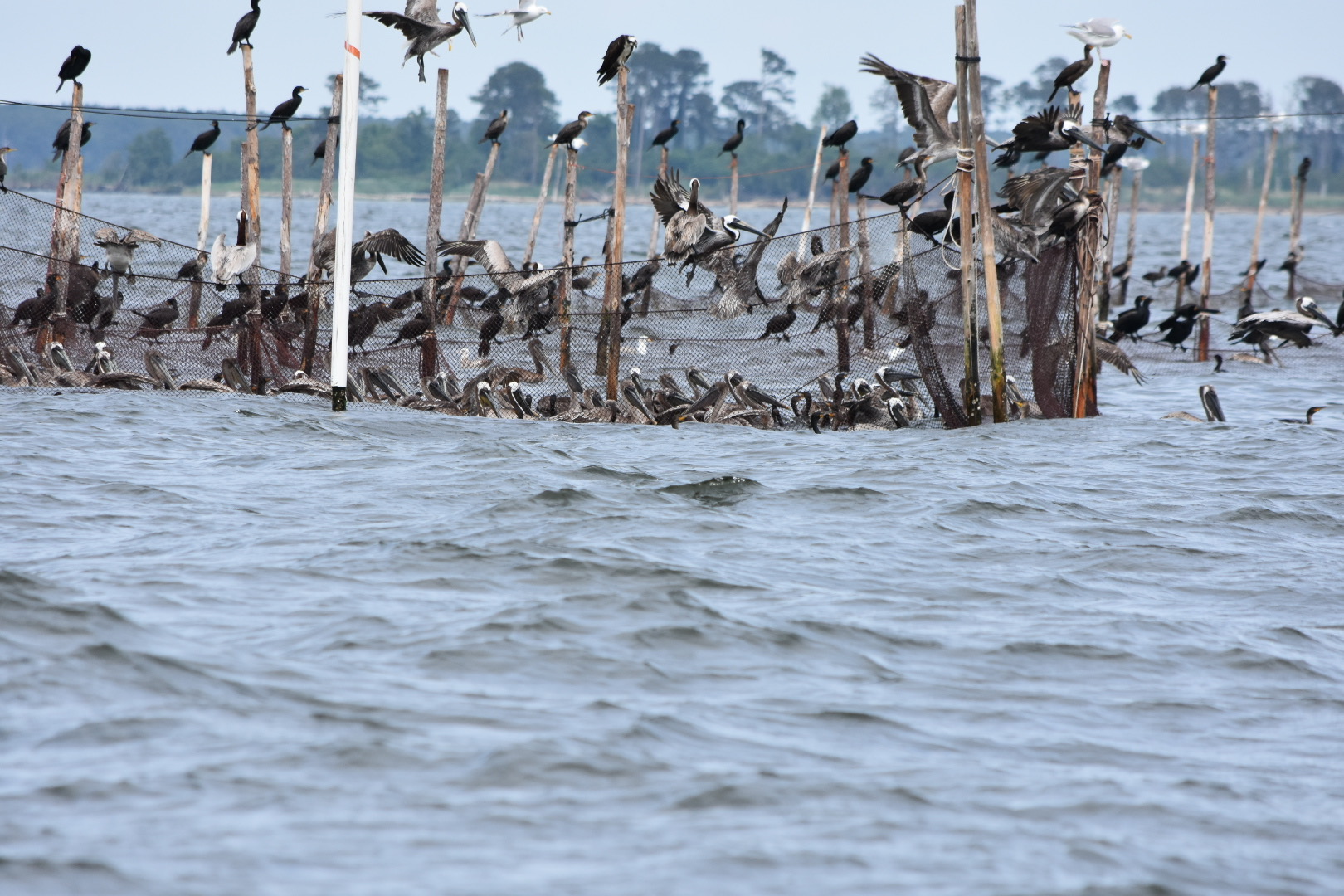 From there it was a ten minute motor back out to the mouth of mill creek where we dropped the hook and watched pelicans working the water. We also saw the Reedville menhaden fleet come into the little cove there and net out all the fish. Ridiculous.